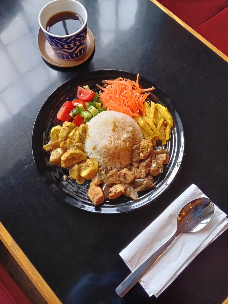 メニューに関しては私自身が過去にスリランカカレーなどを提供するカフェ(国内でフェアトレード輸入・卸事業を展開する「第3世界ショップ」のカフェ)で働いていた経験があり、私たちChirinが立つ日はこのカレーを主役に。またChirinで自家焙煎するコーヒーもメニューに加えました。(写真:Chirinの自家焙煎コーヒーとスリランカ風スパイスカレー)